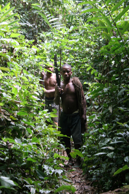 Pygmy village down to the Lobe River. The Pygmy people are forest dwellers, know the forest, its plants and its animals. They live by hunting animals such as antelopes, pigs and monkeys, fishing, and gathering honey, wild yams, berries and other plants. Cameroon.