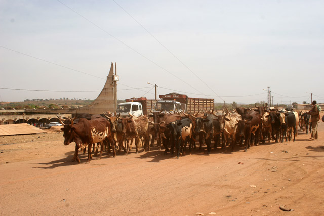 Cattle at N'Gaoundéré town street. Train station is at the back of the photo. Cameroon.
