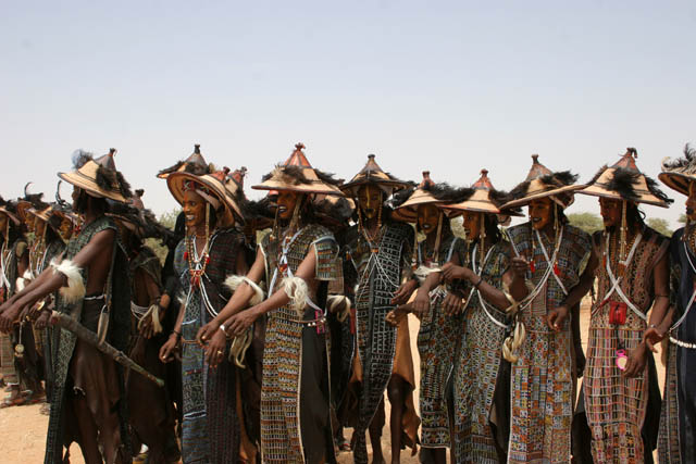 Men from nomadic Wodaabé tribe (also called Bororo) are performing their beauty dance called Yaake at their Gerewol festival. Niger.